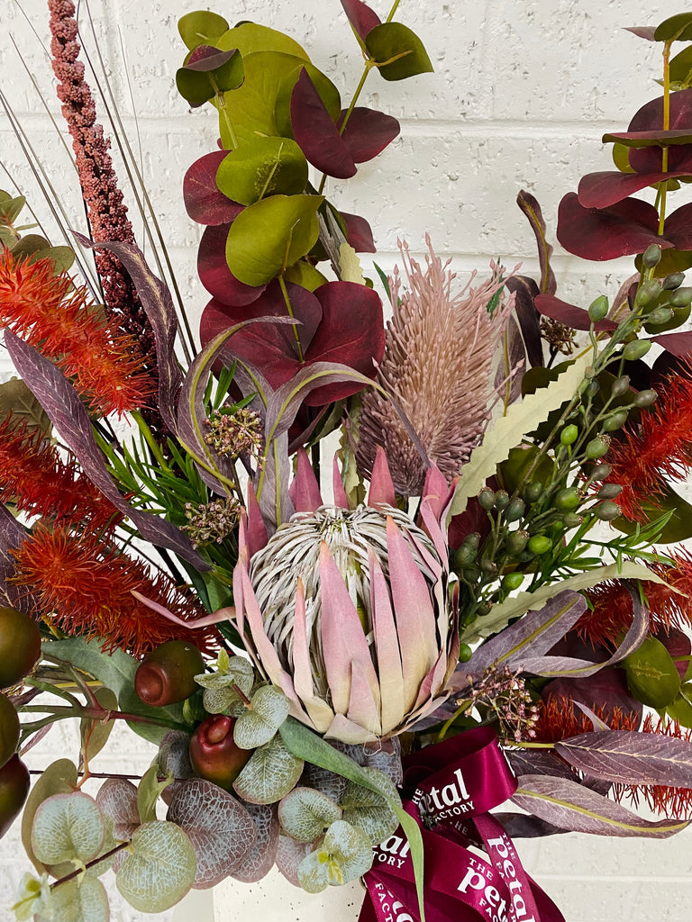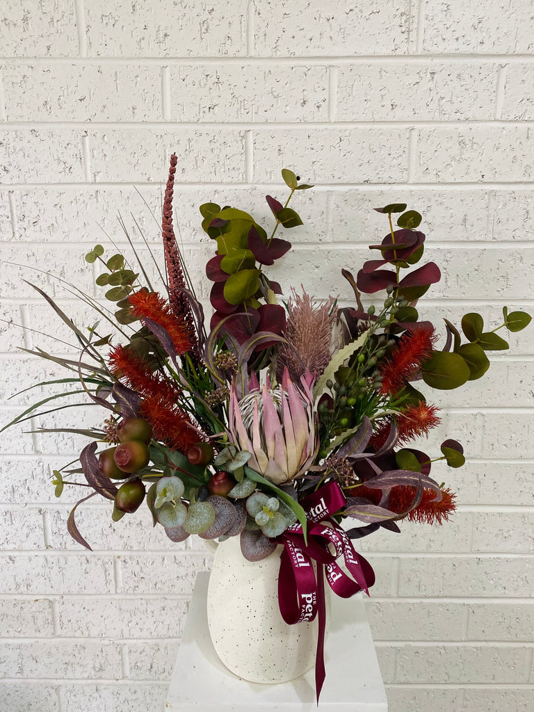 Set into a textured bespeckled ceramic container, this artificial arrangement stands tall and will be sure to wow all in its vicinity.