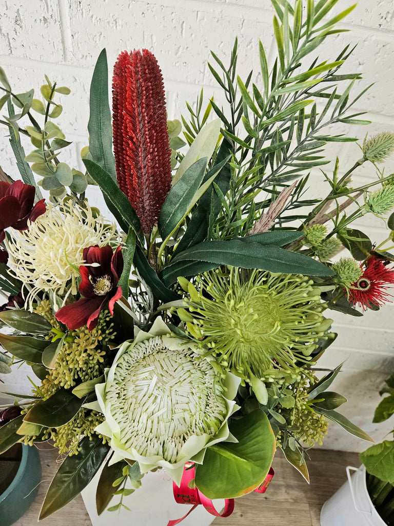 All shades of Red & Greens, this Artificial Flower arrangement is filled with an abundance of blooms stylishly created into a classic white ceramic pot.
