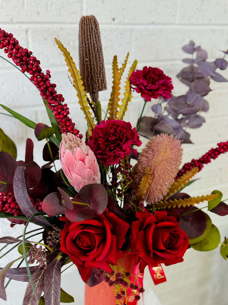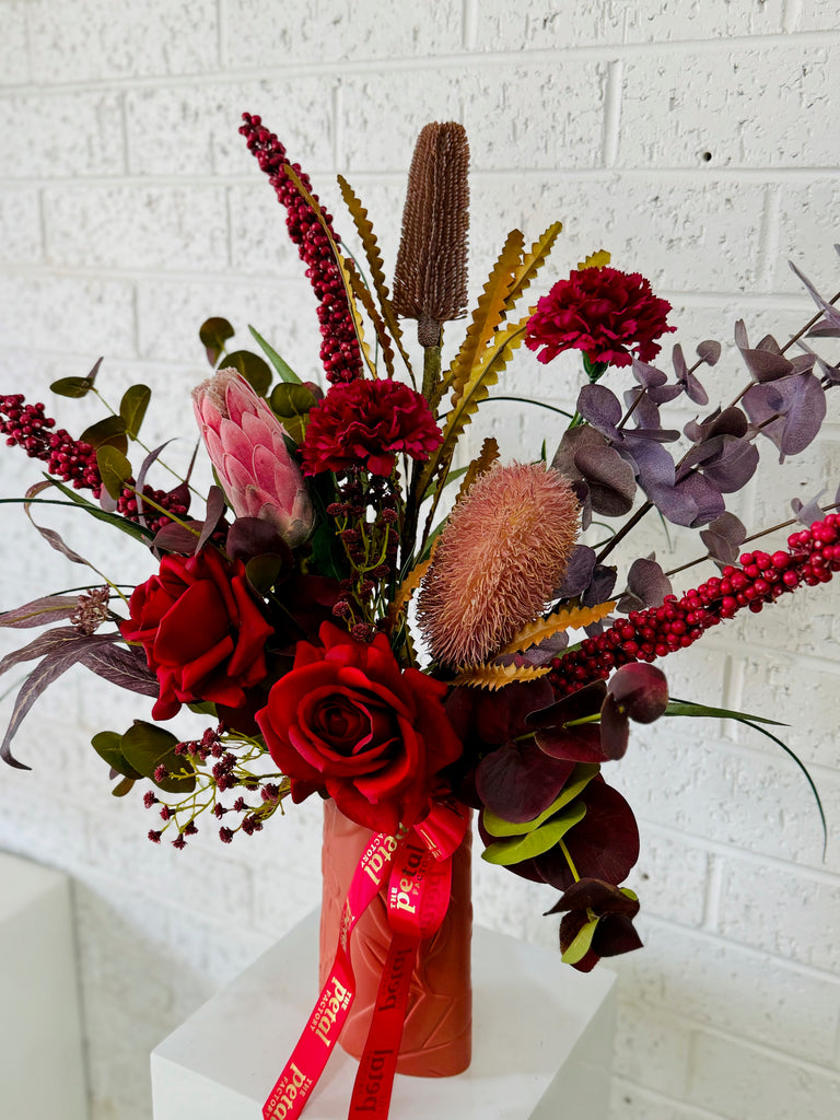 The perfect blend of pink, red and burgundy blooms set into a red textured ceramic pot. Ruby has been designed with expertise featuring red real touch roses, banksia, berries and burgundy eucalyptus gum.