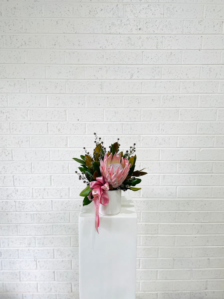 This beautiful arrangement features a stunning King Protea flower with seasonal foliage and filler flowers.