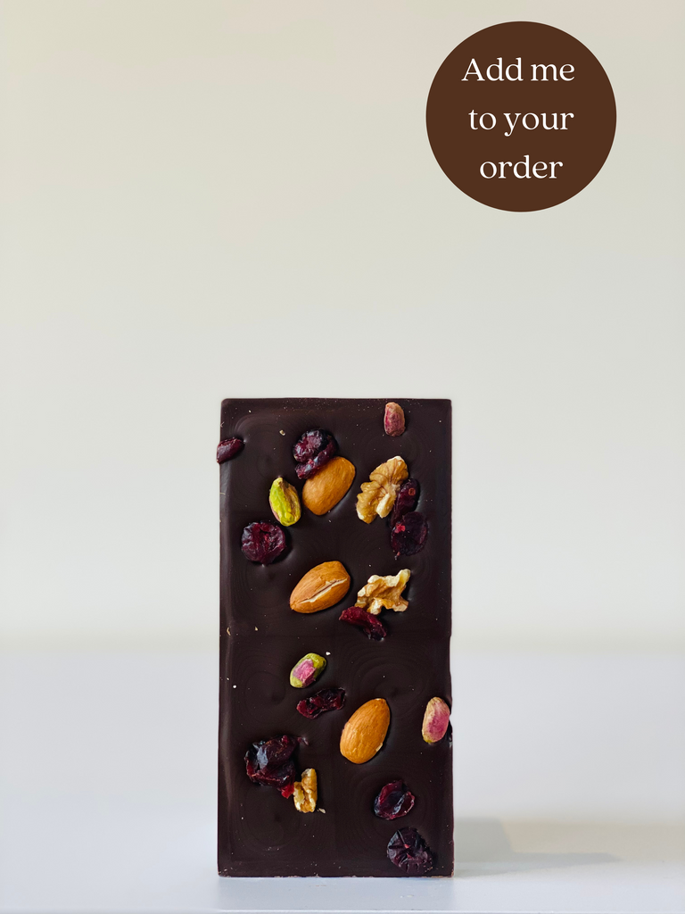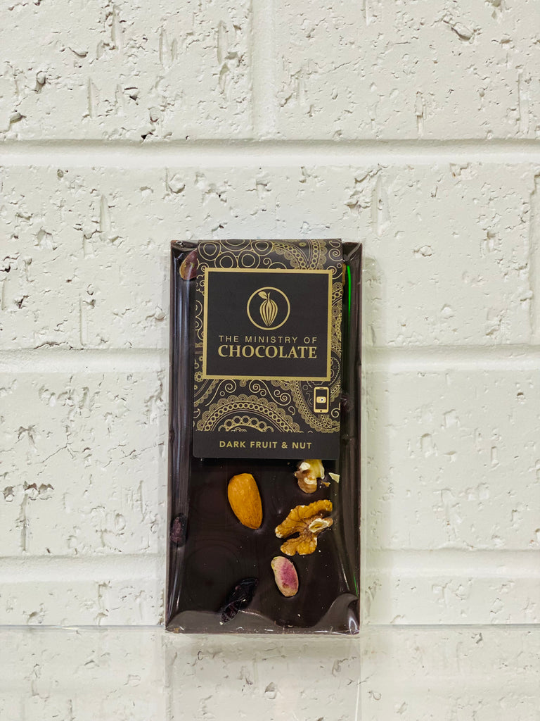 Dark Belgian couverture bar, with mixed roasted nuts and dried fruit.Contains dairy & soy lecithin.