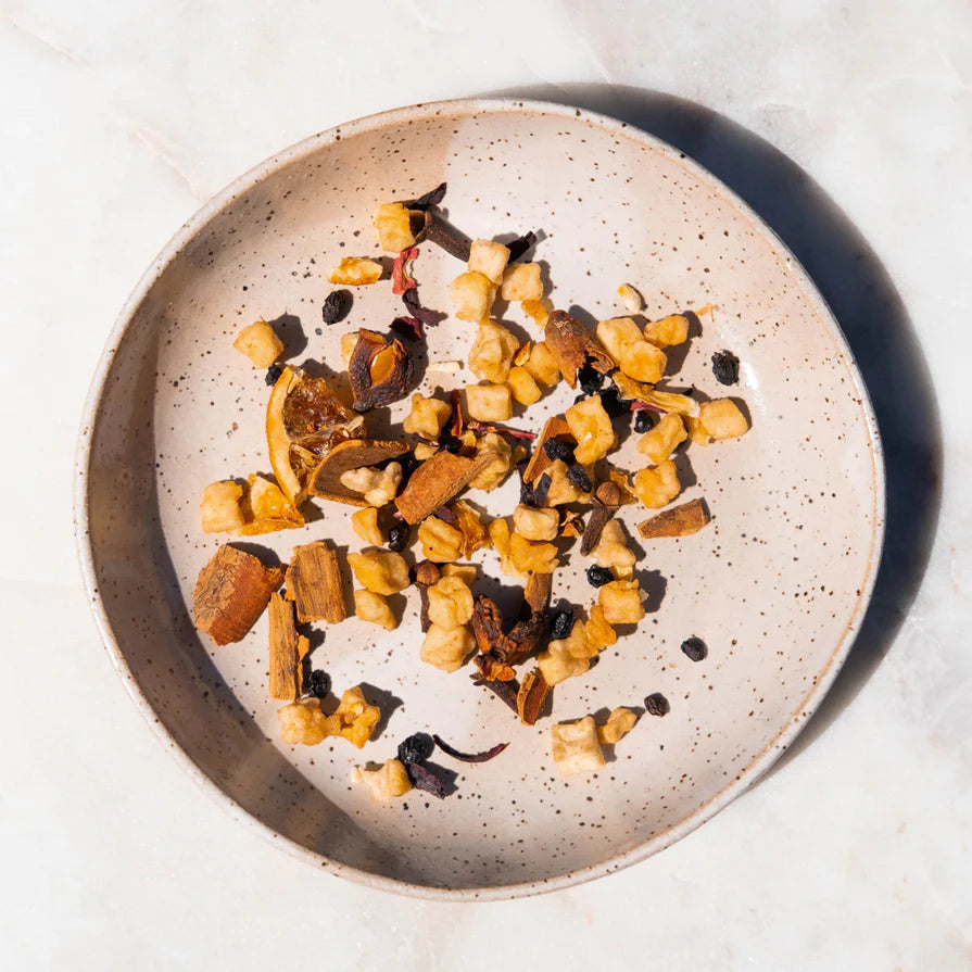The deliciously sweet notes of apple sing through soft notes of warm cinnamon, orange, and clove. Simultaneously, a gentle tanginess from elderberries and hibiscus hums through the blend ever so slightly. Pure joy!