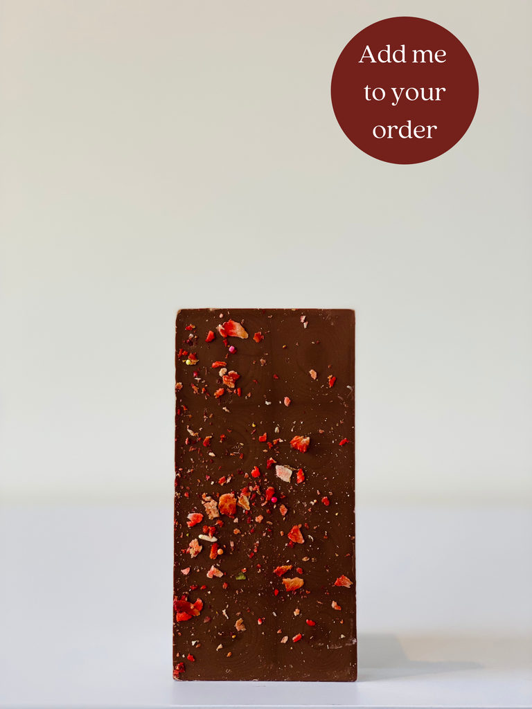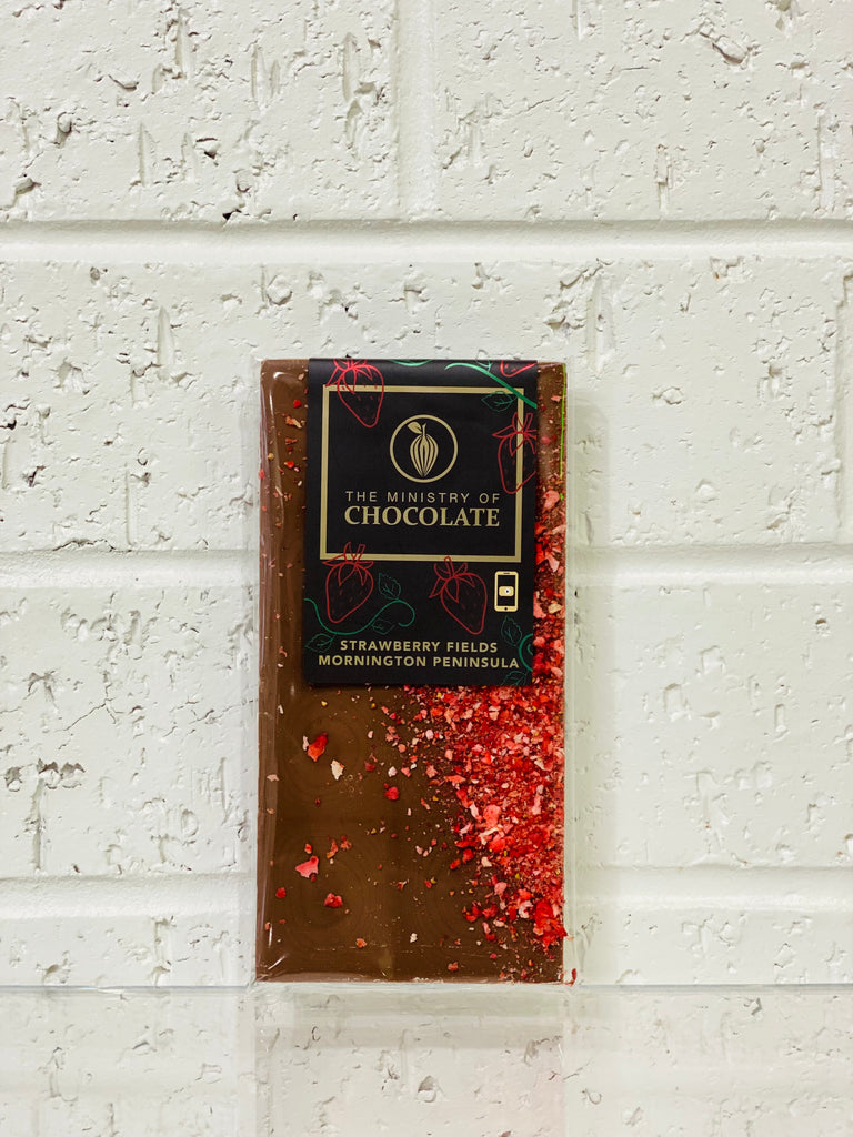 Milk Belgian couverture bar, with local freeze dried strawberries from Melbourne’s Mornington Peninsula.Contains dairy & soy lecithin.
