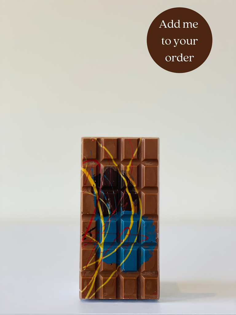 Milk Belgian couverture bar, with coloured chocolate splatters.